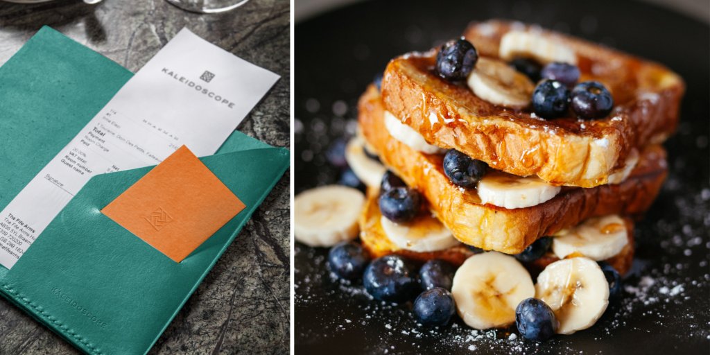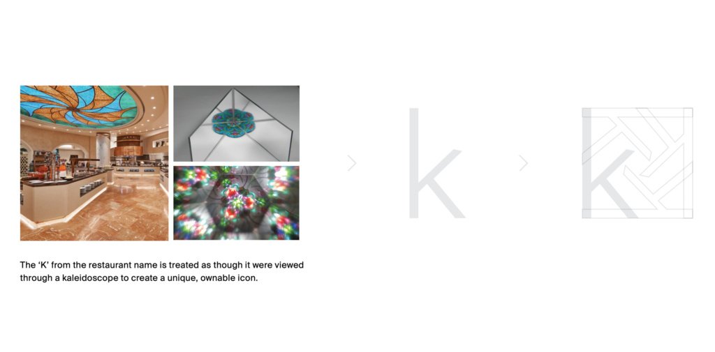 The visual identity is inspired by the functional aspect of a kaleidoscope, interpreted in a modern and elegant way that reflects the restaurant’s environment. The unique icon reflects the functionality of a kaleidoscope using the letter “K” from the name.
